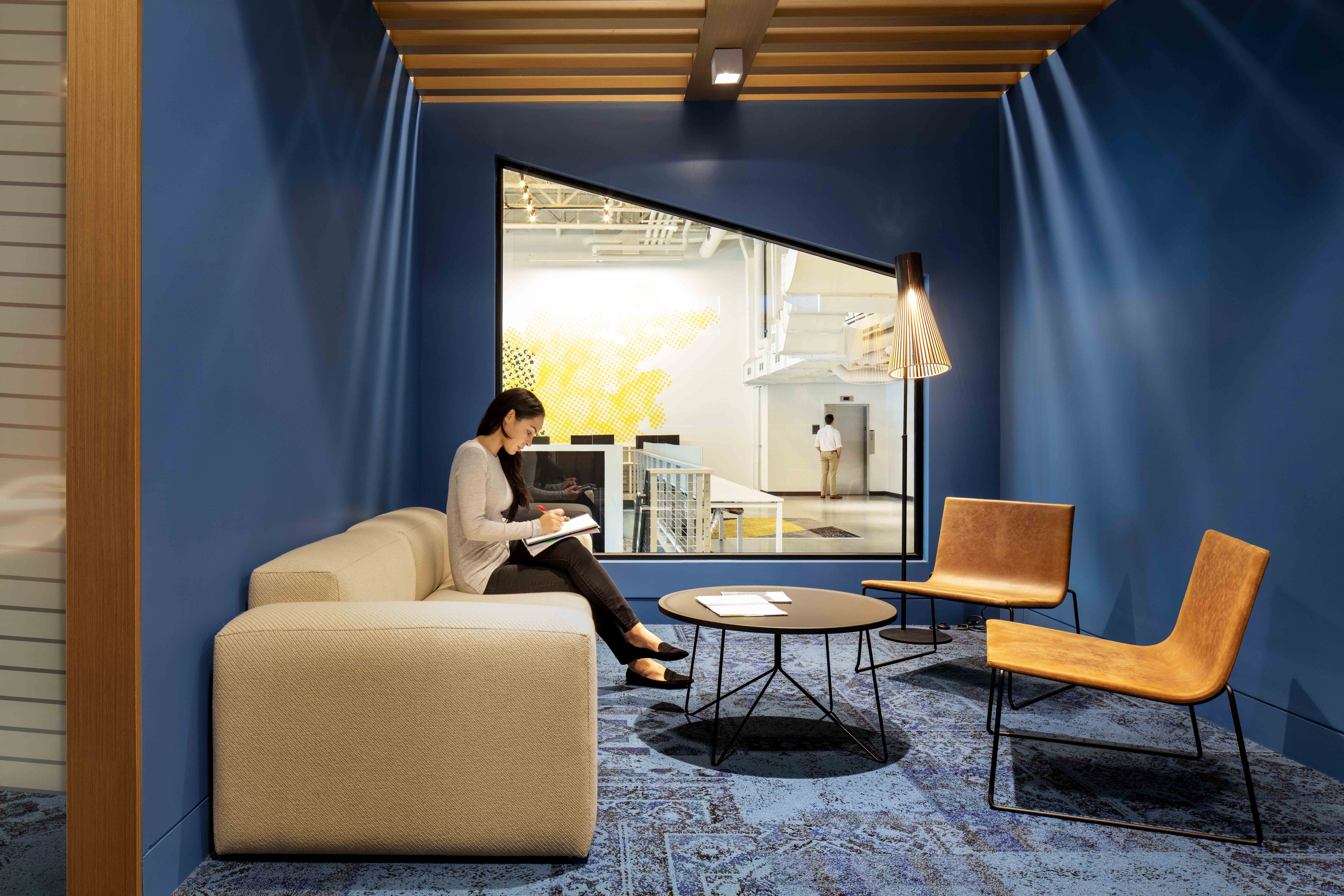 The space is programmed with a variety of different work settings, the open office spans the first level and mezzanine with huddle rooms, dubbed “nodes” interspersed between for team meetings. A large all-hands space comprised of tiered seating and a large digital display leads you down to the lower level common areas which include the kitchen and lounge space all purposely built for fostering collaboration and culture.